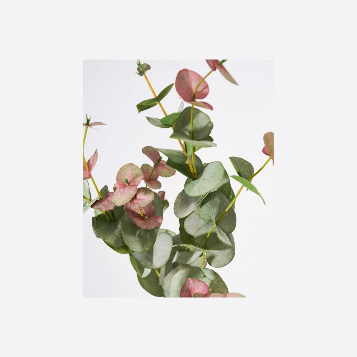 Kunstig stilk med matgrønne blade og et diskret rosa skær, der giver et naturtro udtryk. Stil den alene i en vase for et enkelt look, eller kombiner den med andre grene.