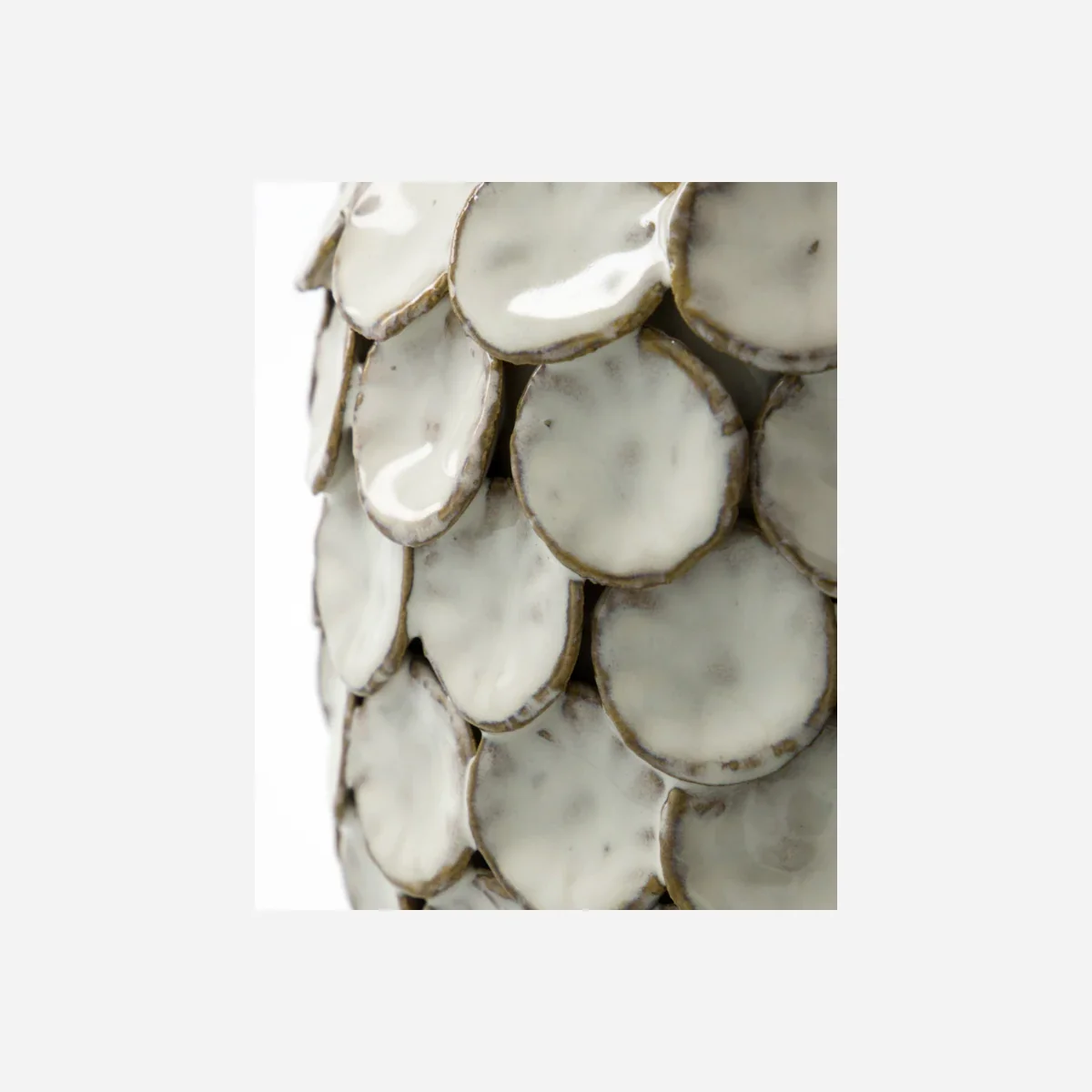Dot fra House Doctor er en lille smuk vase i hvidglaseret keramik. Vasen har små runde dots, som skaber et skjold rundt om vasen. Det giver vasen et anderledes og meget skulpturelt udtryk. Brug den som en fin detalje i indretningen, alene eller med små, afskårne blomster.