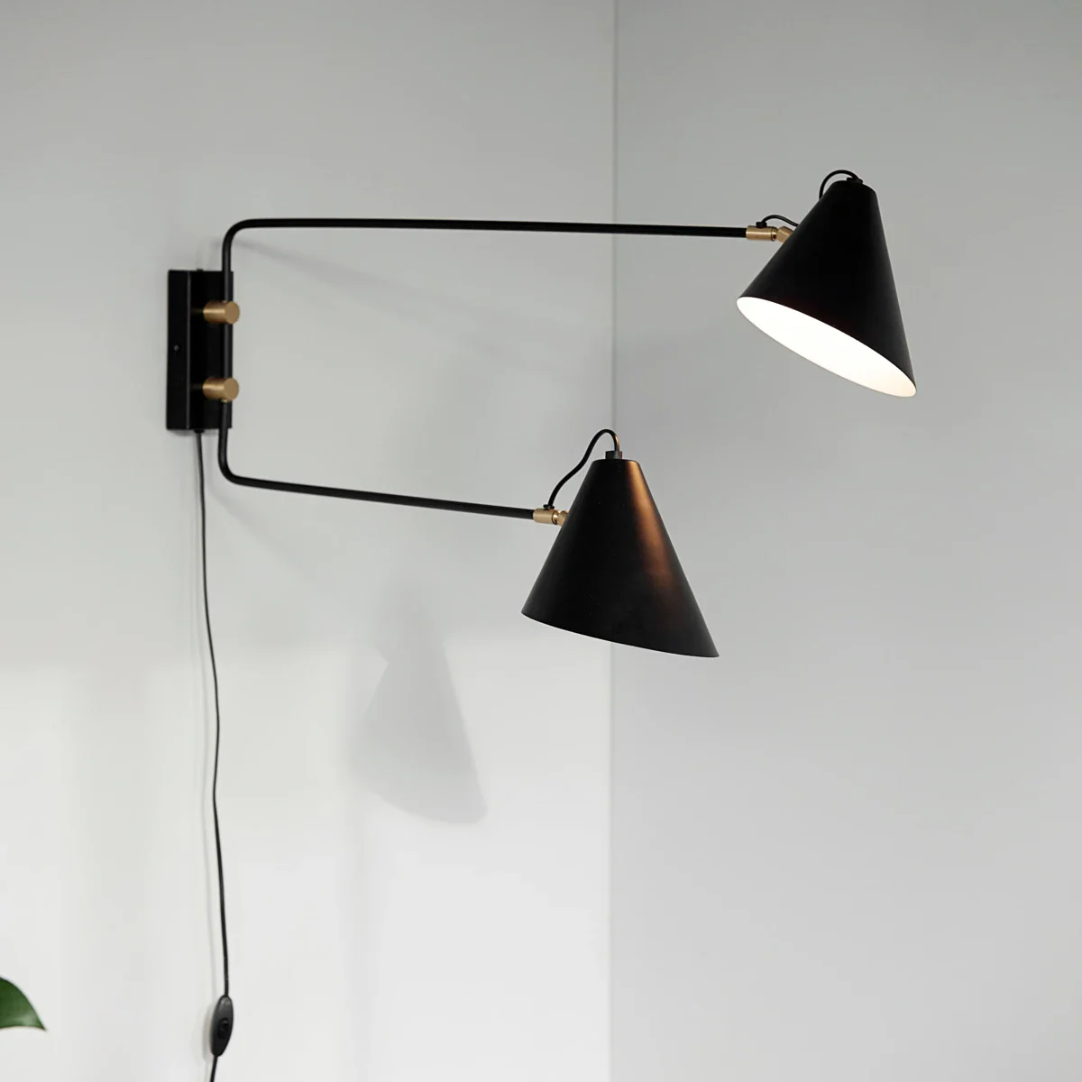 Lamper lyser op i mørket og giver varme og stil til din indretning. Med den dekorative væglampe Club Double fra House Doctor får du både et stemningsfuldt lys til dit rum og en flot udsmykning til væggen. Lampen er egentlig to lamper i ét. Det industrielle design giver et næsten skulpturelt udtryk i indretningen. Kombinationen af sort jern og gyldent messing giver samtidig designet et varmt twist. Lampen har flere funktioner. Armene kan justeres fra side til side, så du kan tilpasse lyset efter behov.