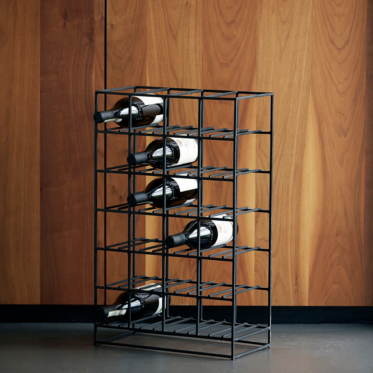 Gemmer du også dine yndlingsvin væk i skabe? Med den smukke 24-vinreol fra House Doctor, kan du gøre din vinopbevaring til et stilfuldt element i din indretning. Reolen er lavet af sort jern og har et flot grafisk udtryk. Det sorte metal giver samtidig et maskulint look, der giver kant til din indretning. Reolen har plads til 24 flasker.